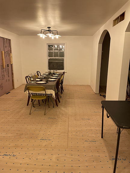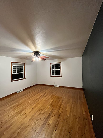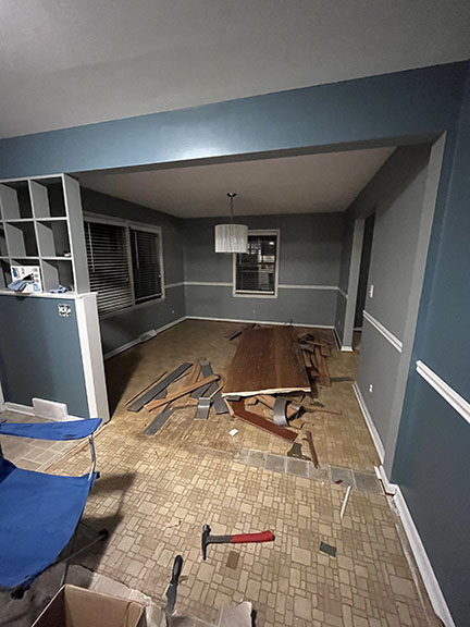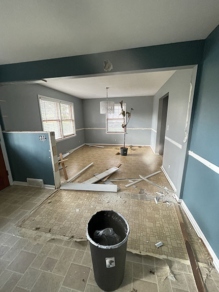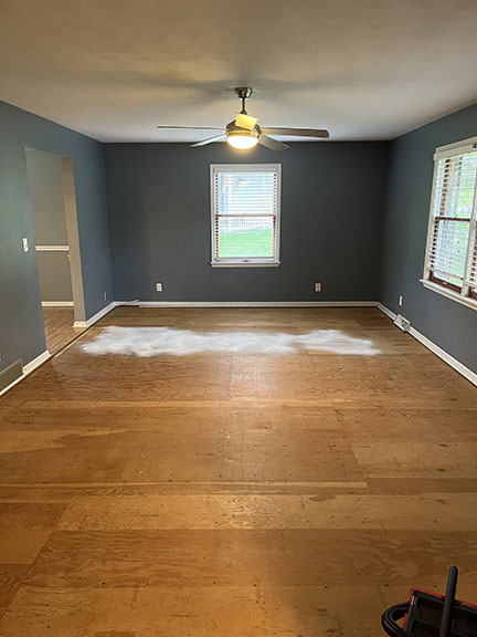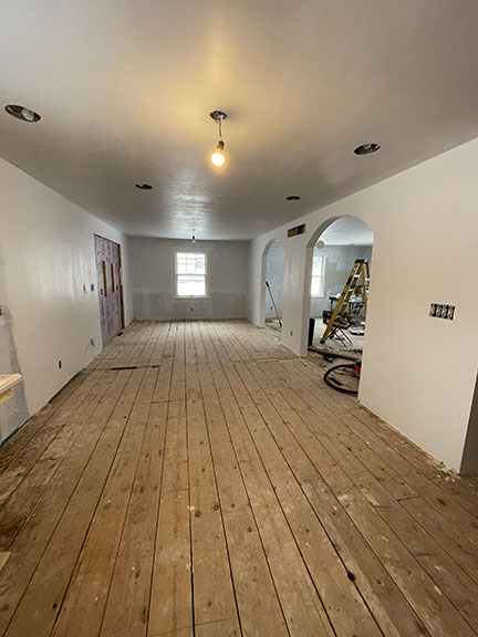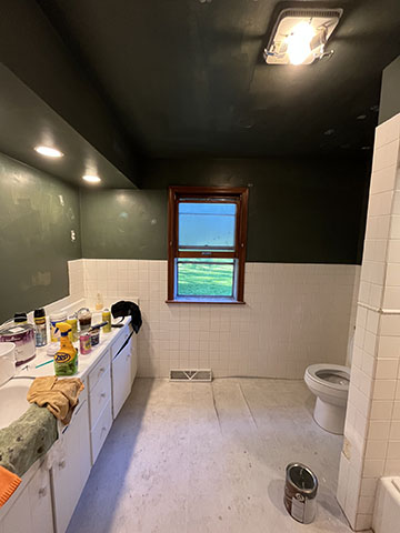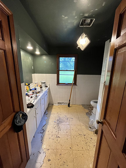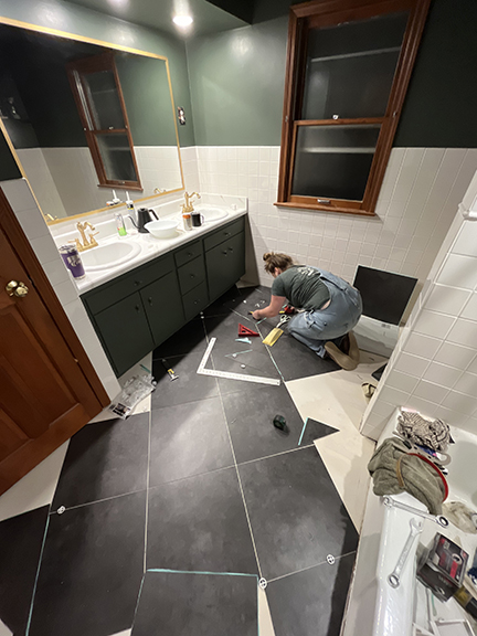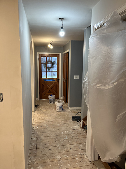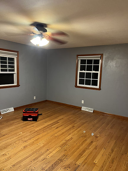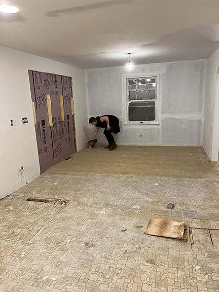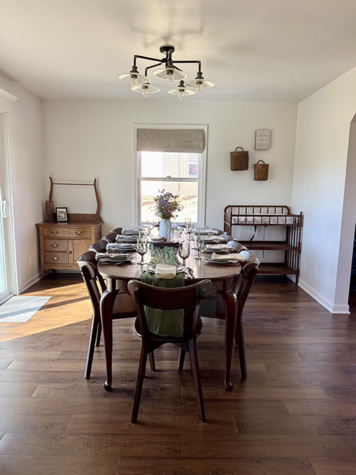 All of the tile, paint, and flooring was done personally by Philip and Emily, with some assistance from family members. Doug Martin was the contracted electrician and Chase Ramseyer also assisted with hanging light fixtures. The original flooring was able to be cleaned and kept, except for the upstairs bathroom, the living room, dining room, and kitchen, where they laid Home Depot’s luxury black peel & stick vinyl flooring. It looked so real – I could hardly believe it was peel & stick!