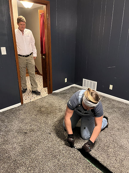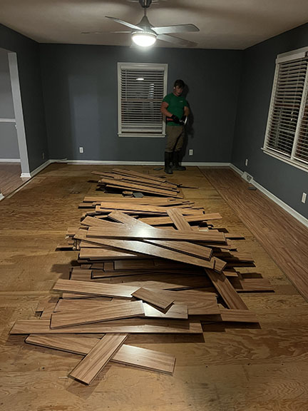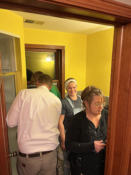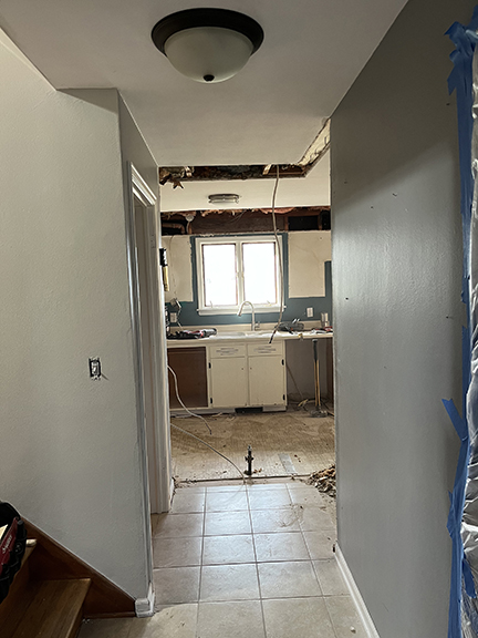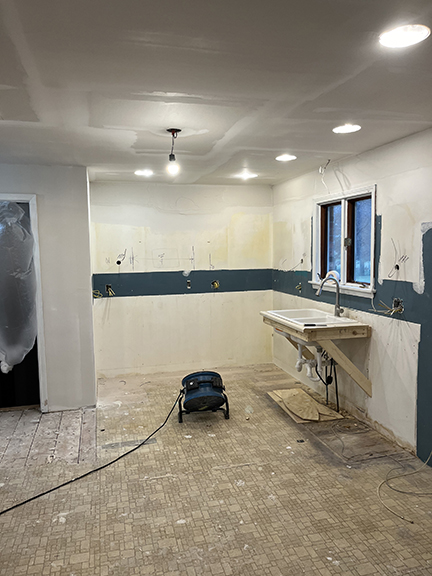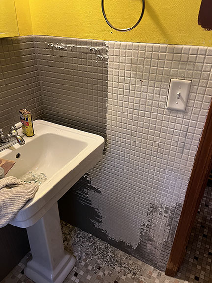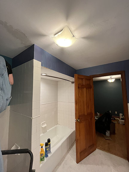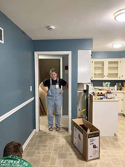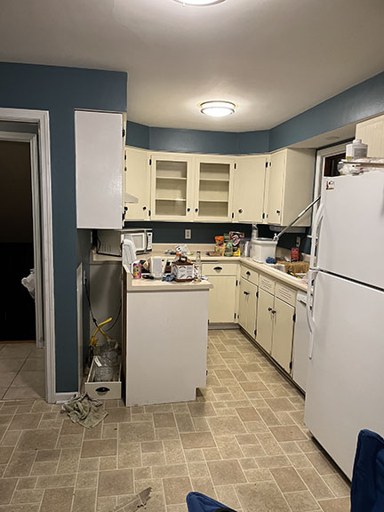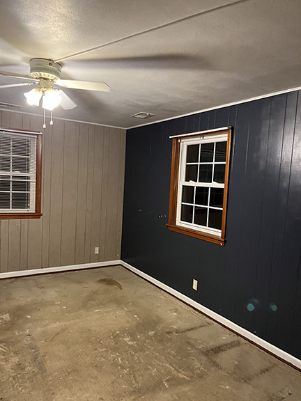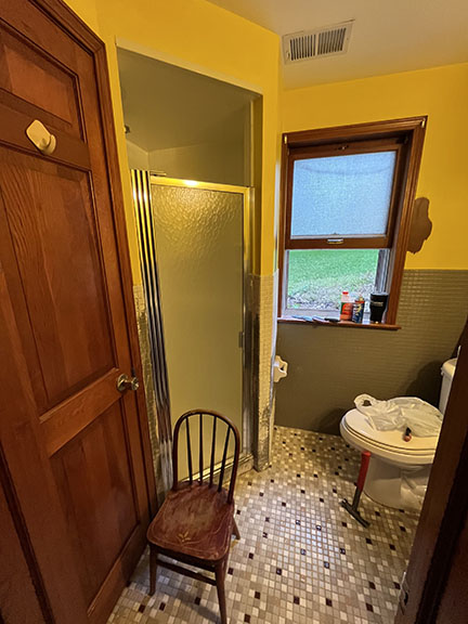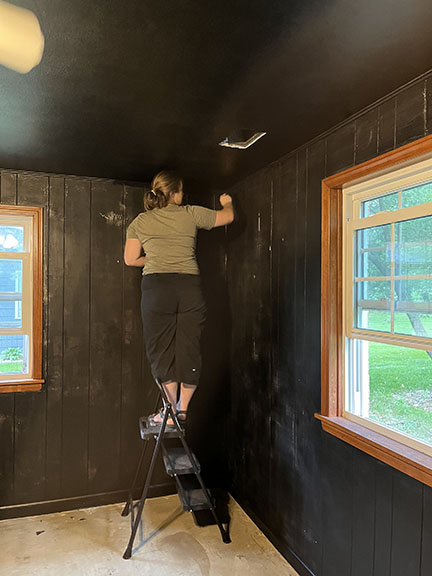 All of the tile, paint, and flooring was done personally by Philip and Emily, with some assistance from family members. Doug Martin was the contracted electrician and Chase Ramseyer also assisted with hanging light fixtures. The original flooring was able to be cleaned and kept, except for the upstairs bathroom, the living room, dining room, and kitchen, where they laid Home Depot’s luxury black peel & stick vinyl flooring. It looked so real – I could hardly believe it was peel & stick!