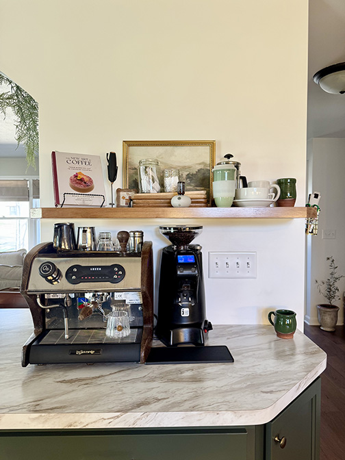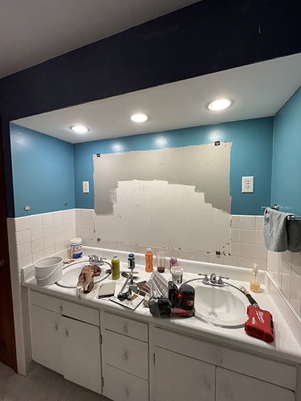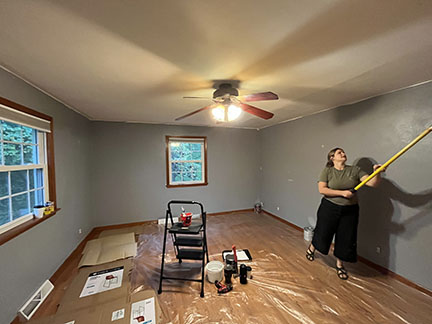 Throughout their home, Philip and Emily put in some artistic touches to really personalize the space and take the remodel to the next level – like silver paint and a feather on the kitchen counter and sink to create a marbled look, or the art piece of Emily’s that is hung in the guest bedroom. This talented couple also tackled the kitchen backsplash on their own, after bartering for a wet saw with a Faire Coffee gift card!