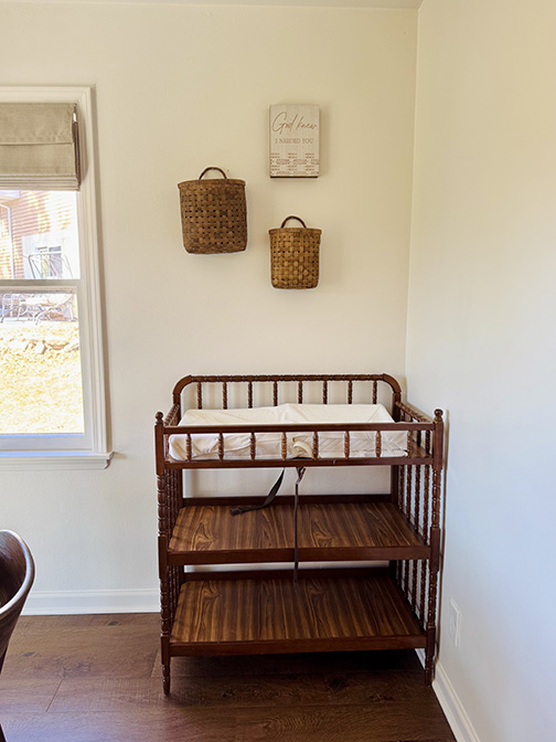 The main living area was painted with Sherwin William’s “snowbound,” which is the perfect shade of white. It’s clean and bright, without feeling harsh. The upstairs bathroom was painted in “pewter green,” and an accent wall in the master bathroom was painted with “rockwood shutter green.” The nursery got an accent wall in Sherwin William’s “vintage leather.”